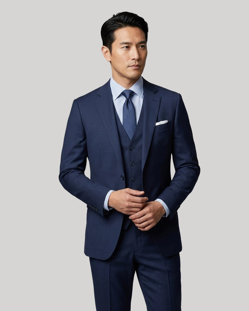 Our fabric range covers every occasion and climate, sourced from leading mills including Vitale Barberis Canonico (VBC), Guabello, Ermenegildo Zegna, Loro Piana, Angelico, Liberty, Maurizo, Vito, and MB Sartorial. During your consultation, we recommend the right cloth for your needs, from Italian worsted wools (Super 110’s to 160’s) and superfine merino (120’s, 130’s, 150’s, plus ultra-fine 15 micron options) to natural-stretch performance wool, tropical and four-season weaves, Lycra stretch suiting, and breathable luxury linen, so your bespoke suit matches your season, occasion, and comfort preferences.